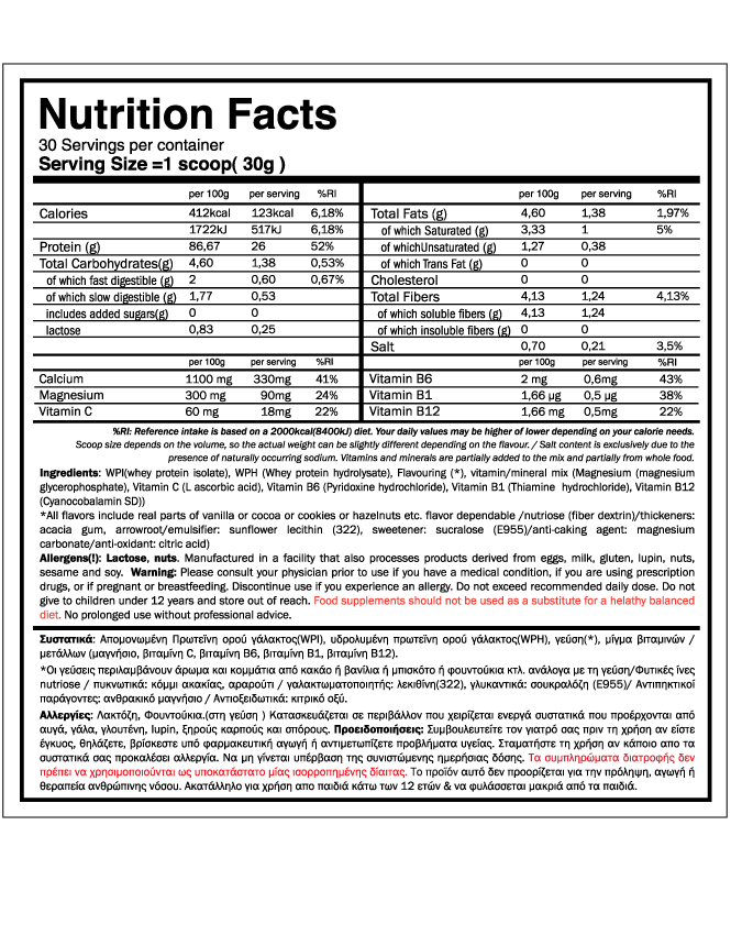 -85% of Whey Isolate (WPI 95%), a clean type of protein that undergoes multiple filtration levels to remove non-protein components such as fat, cholesterol and lactose, resulting in a 95% of real protein component.